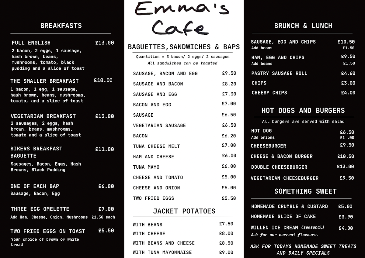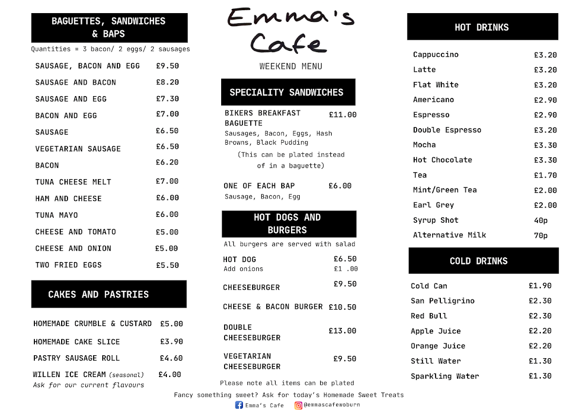 Welcome to Emma's Cafe, a biker-friendly haven nestled beside the Triumph dealership on George St, Woburn. Known for its laid-back atmosphere and excellent service, this cafe is a primary stop for riders and locals alike. Their menu boasts mouthwatering options including freshly prepared hot dogs, hearty cheeseburgers, and unique specialty sandwiches like the Bikers Breakfast Baguette. Each dish reflects a commitment to quality, with ingredients cooked to order, ensuring every bite is bursting with flavor.